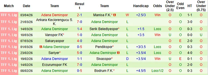 Thống kê phong độ 10 trận gần nhất của Adana Demirspor