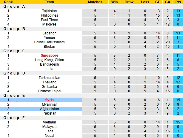 Syria đang dẫn đầu bảng E với 15 điểm tuyệt đối sau 5 trận toàn thắng, ghi 16 bàn và chỉ lọt lưới 1 bàn. Trong khi đó, Afghanistan đứng thứ 3 với 2 điểm (2 hòa, 3 thua) và đã chính thức hết cơ hội cạnh vé đi tiếp vào vòng chung kết.