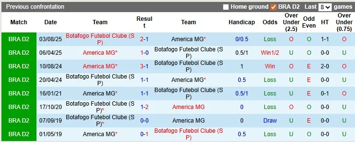 Thống kê phong độ, lịch sử đối đầu của America MG đấu vs Botafogo