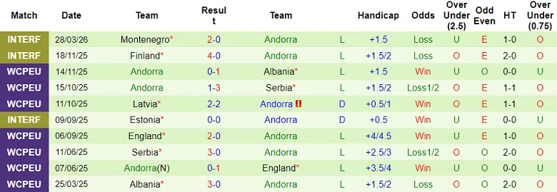 – Thống kê kết quả 10 trận gần nhất của Andorra