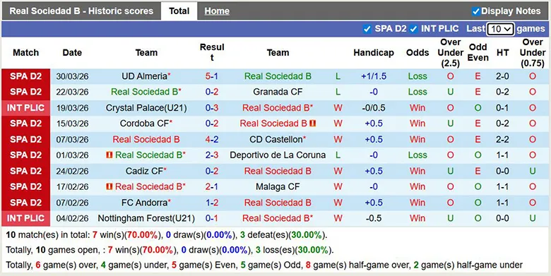 – Thống kê phong độ 10 trận đấu gần nhất của Real Sociedad B