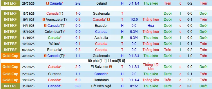 + Canada thua cả 2 trận gần nhất trên sân nhà theo kèo châu Á, đó cũng là 2 trận giao hữu chuẩn bị cho World Cup 2026.
