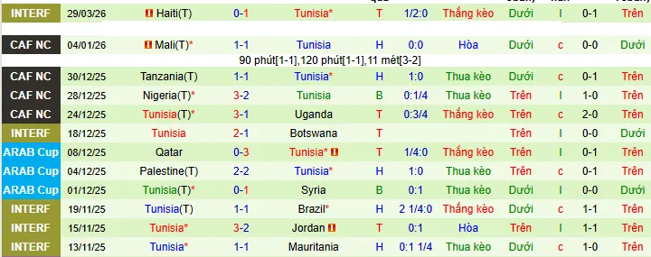 + Tunisia thắng 3 hòa 1 thua 2 trong 6 trận vừa qua theo kèo châu Á.
