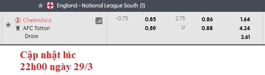 Chelmsford đã thắng kèo châu Á 20 lần trong 39 trận từ đầu mùa, trong khi AFC Totton chỉ thắng 17 trận. Đội chủ nhà cũng thắng kèo 6 trong 9 trận gần đây, trong khi đối thủ lại thua kèo 4 trong 5 trận vừa qua. Mức chấp lên tới 3/4 được coi là đáng tin cậy với Chelmsford.